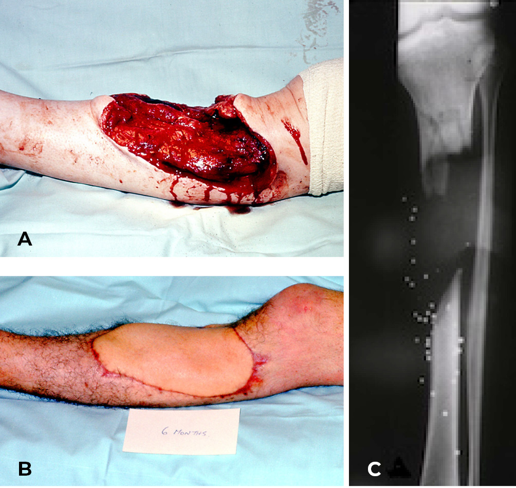 On 20 January 1973 the free groin flap was transferred successfully at PANCH for the first time.2,3 One week later, a 19-year-old young man was admitted to the same hospital with a shotgun injury to his left leg (Figure 1A). The wound included skin, most of the anterior muscle compartment and a 12.5 cm defect of the tibia (Figure 1C).