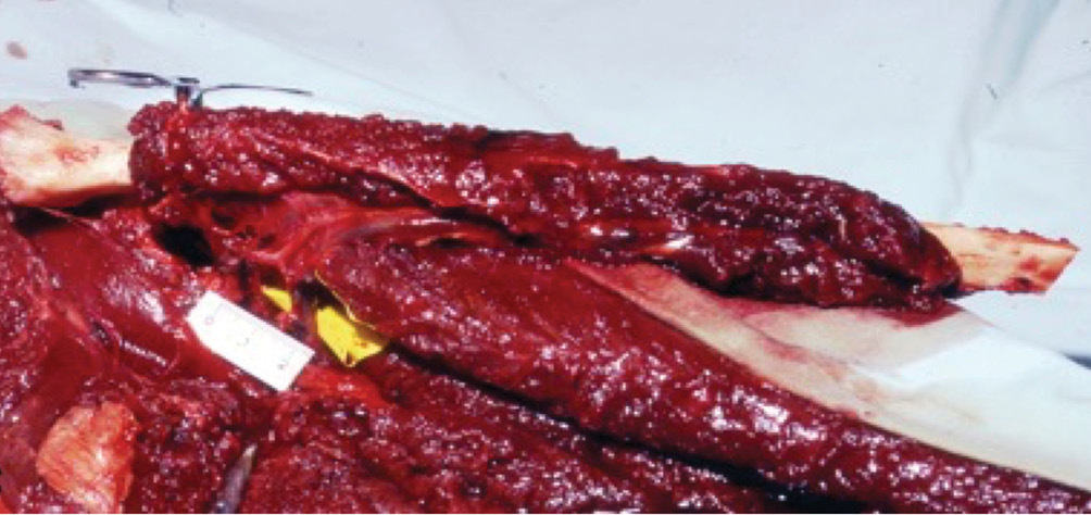 With the patient prone, the legs were dissected simultaneously under tourniquet via posterior incisions. The fibula with a 1 cm cuff of muscle was raised on the peroneal vessels in the right leg. The recipient posterior tibial vessels were dissected in the left leg and a vascular clip was applied to the artery. Tourniquets were released in sequence. Bright bleeding was evident from the muscle cuff, periosteum and medulla of the donor fibula (Figure 3). A normal flow to the foot was noted to the recipient leg, now supplied by just the peroneal artery.
