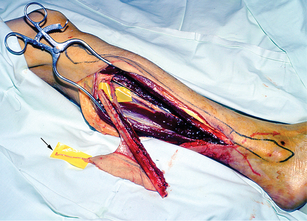 The fibula is now more mobile. Trace the peroneal vessels with a sleeve of muscle as they course from distal to proximal, either adjacent to the septum separating the tibialis posterior and FHL, or within the latter muscle. Define their origin from the tibioperoneal bifurcation.