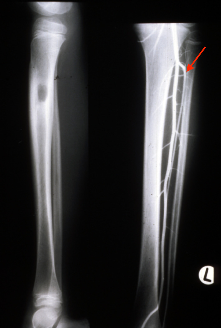 In 1983, a nine-year-old girl presented with a Ewing’s tumour of the right tibial diaphysis (Figure 10 left). She was treated initially with chemotherapy for 12 months with a good result. Segmental resection of the tibia was contemplated and we were invited by Ian Torode and Bob Dickens to consider a fibula reconstruction at the Royal Children’s Hospital Melbourne. Preoperative angiography however, revealed a single peronea magna supplying the foot in the other donor leg. The anterior tibial artery was diminutive (Figure 10 right) but was considered to be of a sufficient size to nourish the fibula transplant.