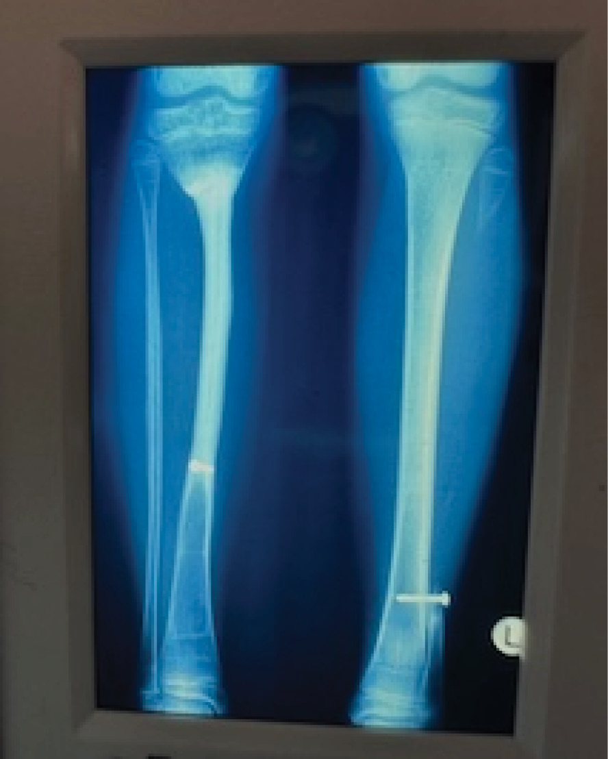 At three months the distal end of the fibula graft had united to the tibia. The fixateur was removed leaving behind the transfixing pins that were fixed into an above-knee plaster cast. At eight months the cast was removed, the limb placed in a caliper and weight bearing commenced. Union was noted at the upper end (Figure 11B). By two years dramatic hypertrophy of the transplanted fibula was noted together with growth from the proximal epiphysis (Figure 11C). The limbs had almost identical length (Figure 12), the knee and ankle joints were normal and the only disability was temporary weakness of the EDL in the donor leg.