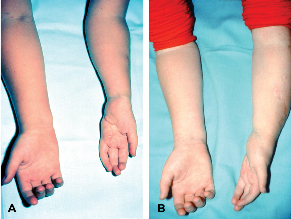Bony union of the fibula to the radius was evident at six weeks. Serial X-rays of both forearms were made at three-monthly intervals over the next four years and the results confirmed with bone scans. These revealed an average growth rate of 5 mm per year of the fibula growth plate, which compared with that of the distal radial epiphysis in the opposite forearm (Figure 16A) and the proximal growth plate in the fibula of the normal left leg (Figure 16B).