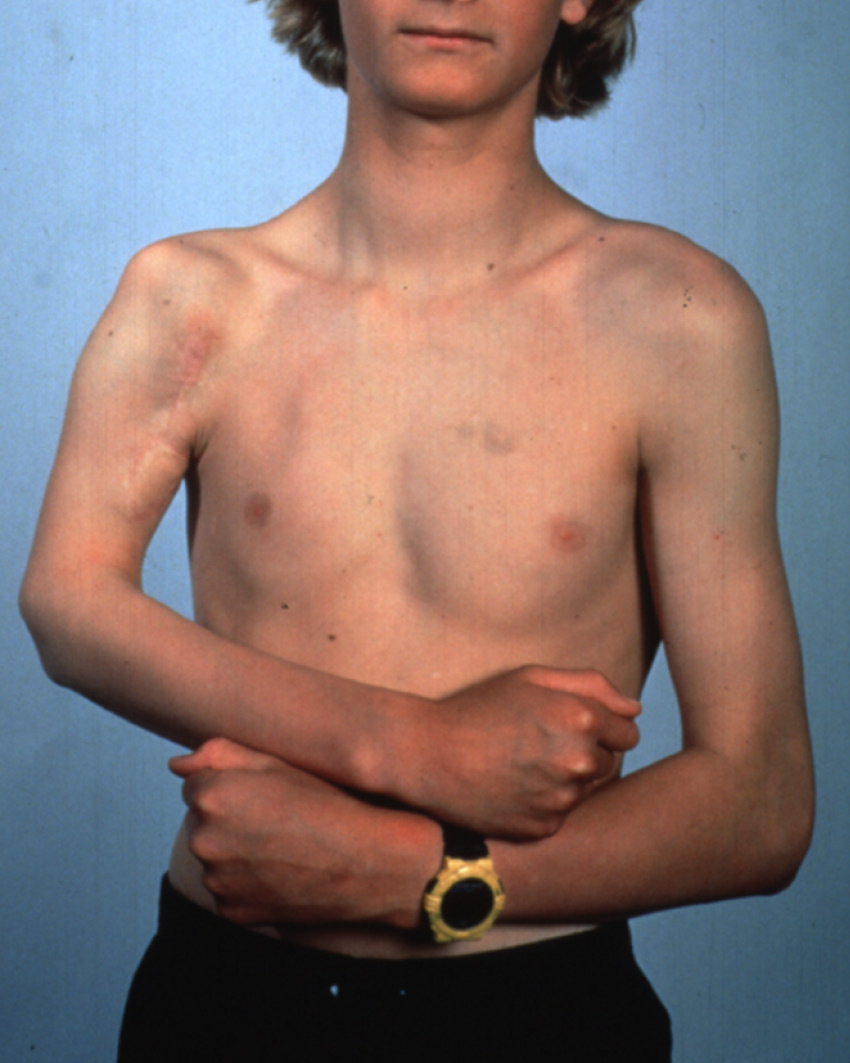 The bone transplant united to the humerus and fibula growth occurred at a rate similar to the epiphyseal transfer in the previous patient (see Figure 18). He was lost to follow up for many years and was seen again at age 15, when it was found that the upper end of the fibula had dislocated anteriorly and superiorly (Figure 21 and Figure 22). Despite this deformity that understated the true growth in the transplant, he had pain-free movement of the shoulder and was a very active surfboarder.