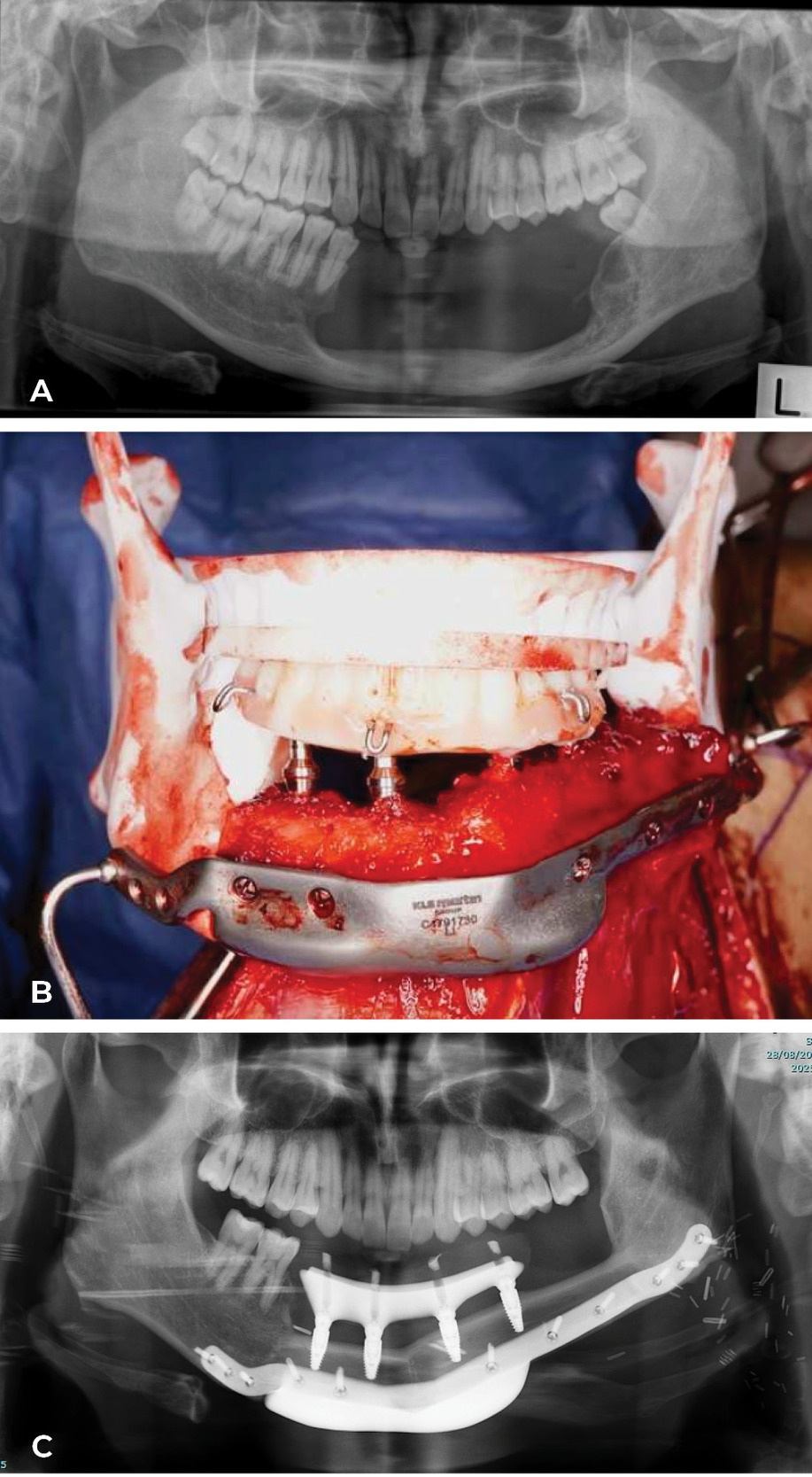 Today the ‘Model T Ford’ has changed shape at the Royal Melbourne Hospital. The computer (3D printing) is used to generate a replica of the fibula, selected after angiography, plus the patient’s jaw segment to be removed. Key osteotomies, with their site and angle, are designed on the fibula replica to reconstruct the shape of the jaw. In a case Ian watched in theatre, the fibula reshaping was done and fixed with plates while still attached in the leg. The fibula was detached, fixed in the mandible and dentures inserted at predetermined sites to match the occlusion of the upper jaw. The patient went to theatre with a tumour in the jaw and woke with a new set of teeth! A case done by Anand Ramakrishnan, Head of Plastic and Reconstructive Surgery and the team at the Royal Melbourne Hospital, is shown in Case 6 (Figure 26 and Figure 27). Combined with maxillofacial and oncological surgeons they now provide four separate teams a week at the Royal Melbourne Hospital to treat facial malignancy. In the last 10 years their total of fibula jaw reconstructions is 198.