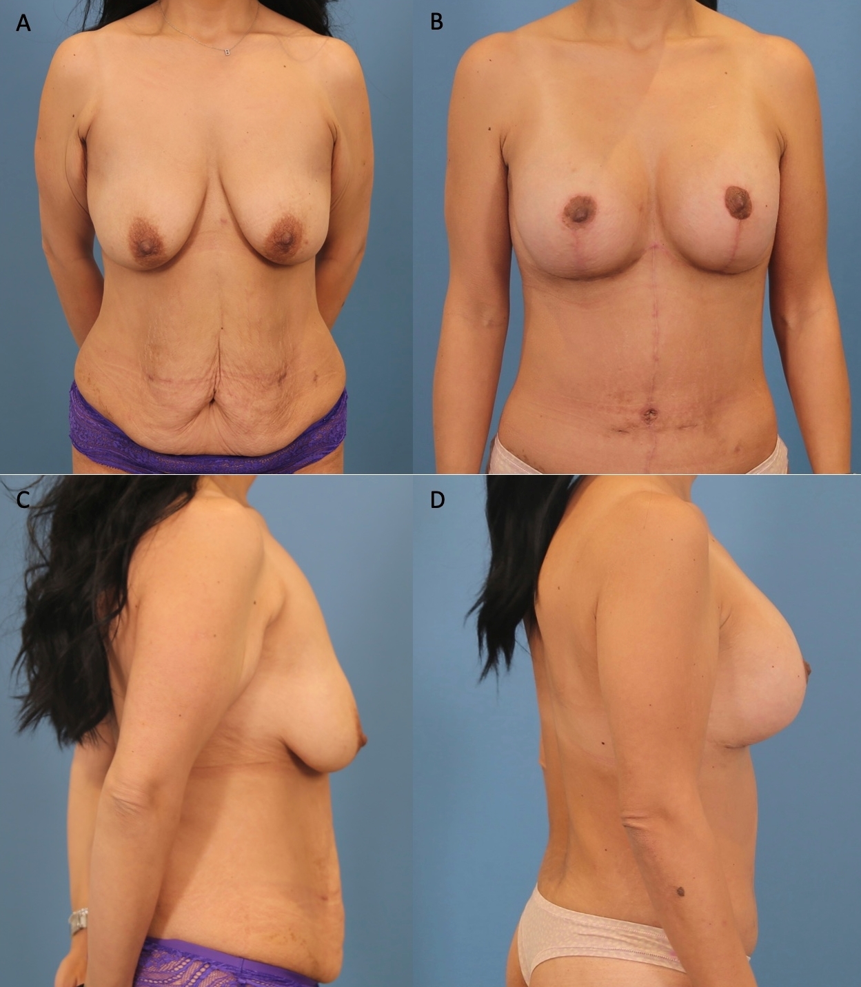 Breast augmentation-mastopexy in patients who have undergone substantial weight loss can be complicated by skin laxity and ptotic, deflated breasts due to loss of volume and ligamentous support, often causing unreliable results.1,2 The weight of the implants may result in bottoming-out deformities leading to inferior displacement of the implant.3 Additionally, the presence of excess soft tissue can result in a waterfall deformity, whereby the breast parenchyma slides over the implant and induces a ptotic appearance.4 Presently, there is a paucity of literature regarding the use of synthetic tissue reinforcements in patients undergoing breast augmentation-mastopexy. Recent systematic reviews5,6 suggest the existing body of evidence favours the promising safety profile of titanium-coated polypropylene mesh (Tiloop Bra Pocket, PFM Medical, Germany). There is an even greater scarcity of research regarding breast augmentation-mastopexy in massive weight loss patients.