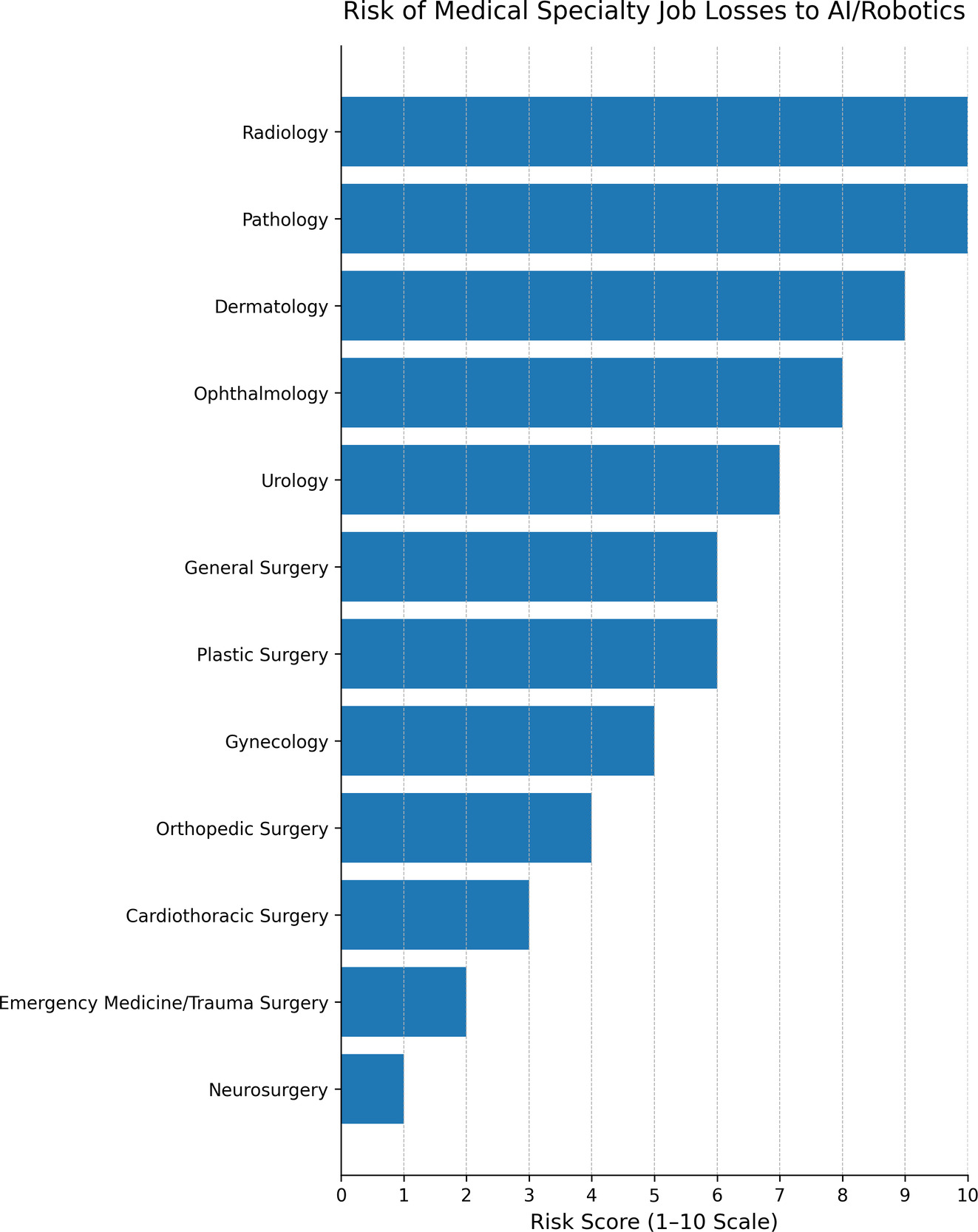 Below is an AI-generated table of at-risk specialties in medicine. It is interesting to see how AI rates the at-risk specialties (see Table 1 and Figure 1).